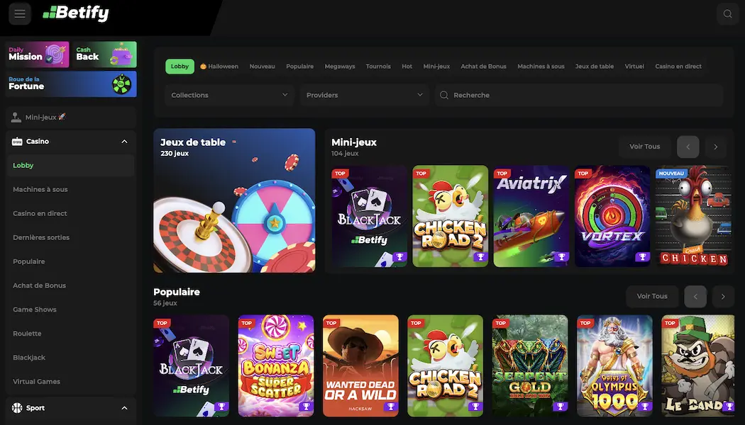 answerBetify propose plus de 3 100 jeux. Vous pouvez jouer aux machines à sous, au blackjack, à la roulette, au poker, aux crash games et aux jeux avec croupiers en direct.