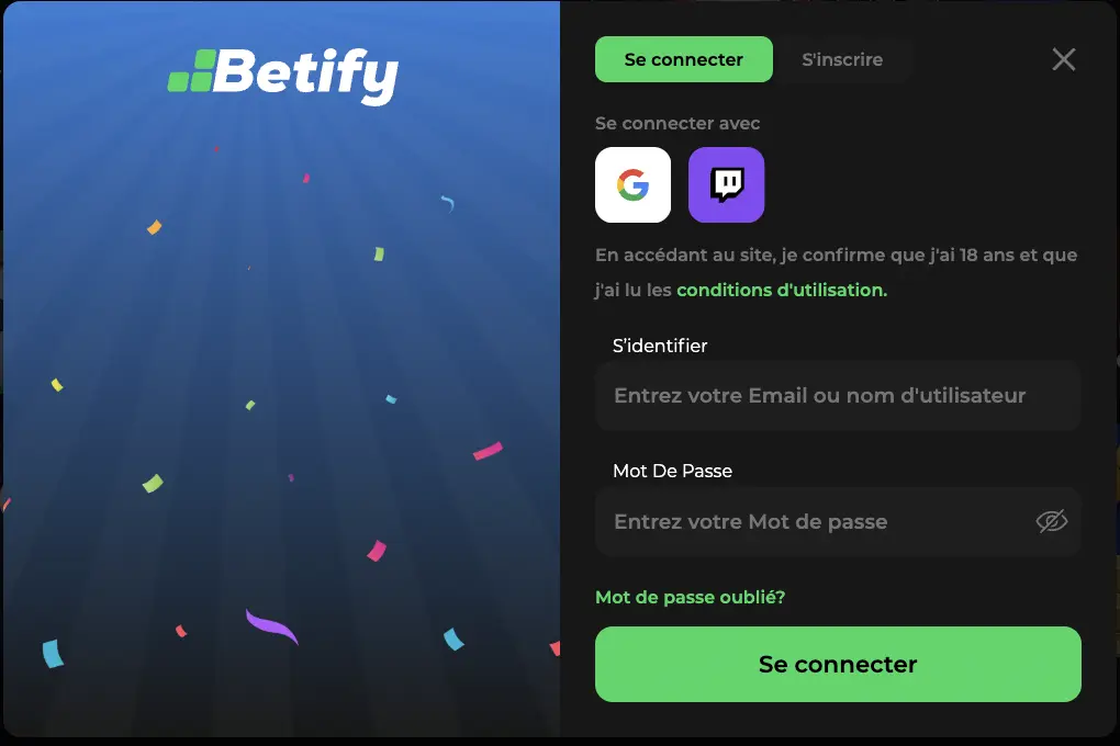Bien entendu, si vous utilisez vos données Twitch ou Google, cliquez simplement sur le logo correspondant à votre choix afin que le Betify Casino login se fasse en utilisant ces informations tierces.