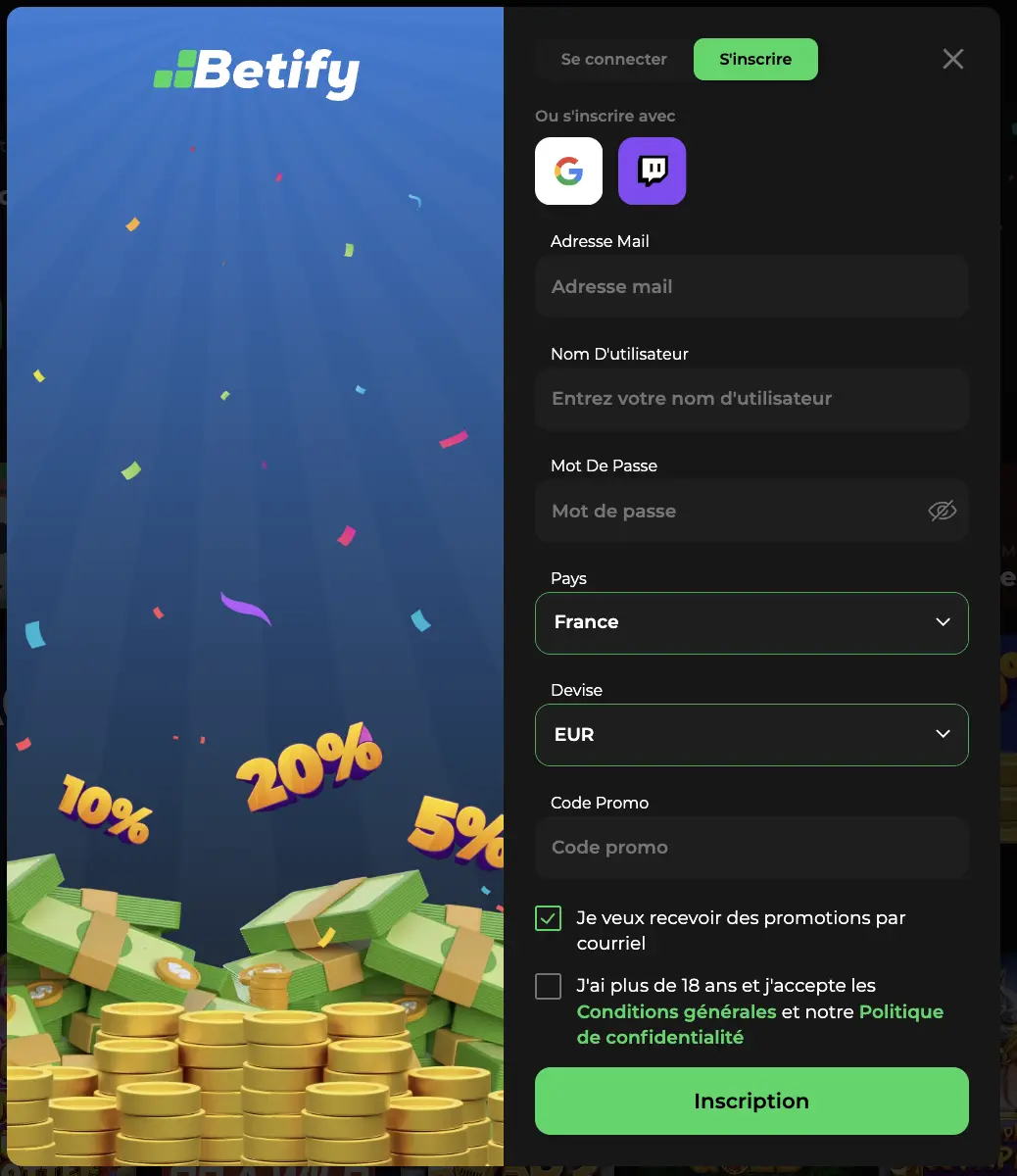 Sachez en outre que le casino permet d’utiliser votre compte Google ou votre compte Twitch pour compléter l votre inscription sur Betify vous servant des données utilisées sur ces réseaux sociaux. Mais trêve de bavardages, voici la procédure: