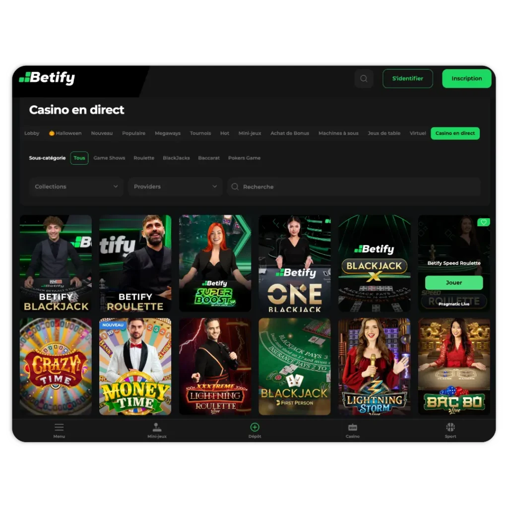 Pour essayer l’un de nos nombreux hits, il faut vous rendre dans la rubrique Betify jeux avec croupier réel. Cette dernière comporte plusieurs sous-catégories :
