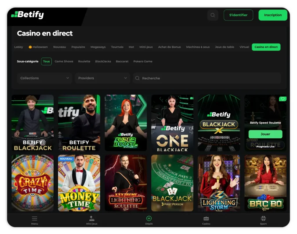 Pour essayer l’un de nos nombreux hits, il faut vous rendre dans la rubrique Betify jeux avec croupier réel. Cette dernière comporte plusieurs sous-catégories :