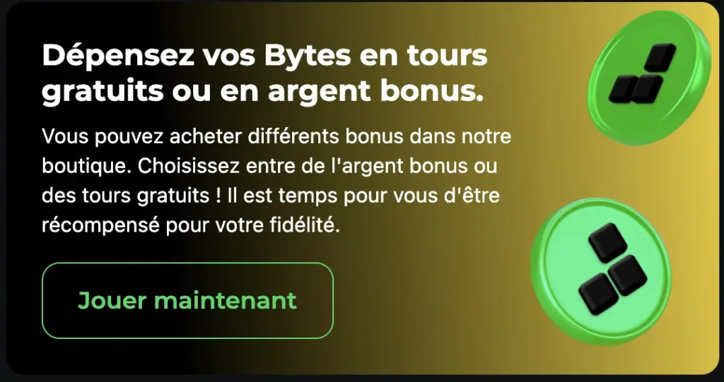 Un grand nombre de bonus Betify attendent les joueurs inscrits. En premier lieu, ces derniers peuvent cumuler des Bytes, qui sont en quelque sorte nos points de fidélité, en jouant et en participant à des challenges. Vous pourrez les convertir au sein de notre boutique et obtenir en retour de l’argent bonus et des Betify free spins.