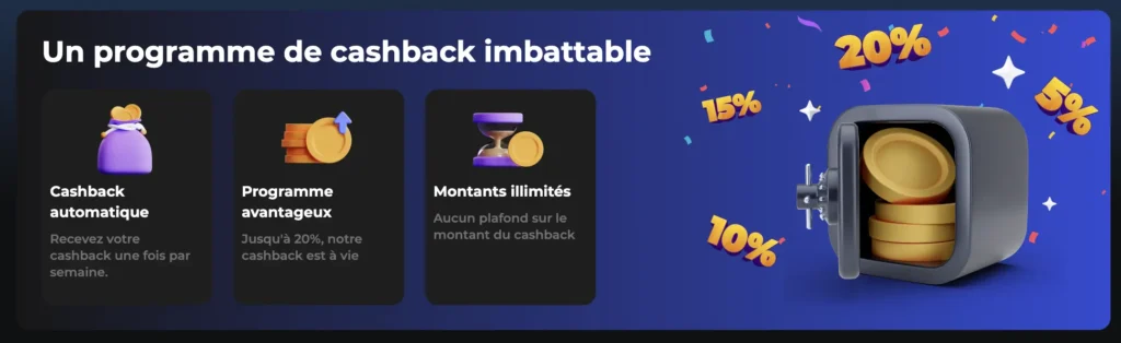 Par ailleurs, sachez que les joueurs novices pourront d’abord bénéficier de 1% de cashback. En jouant plus, et en grimpant les échelons de notre programme VIP, il sera possible d’en obtenir davantage progressivement.